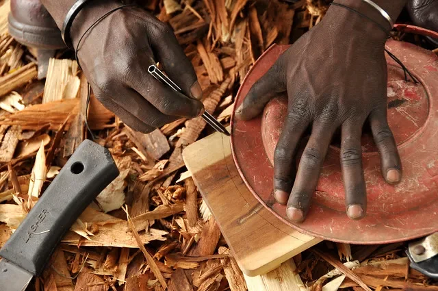 A talented Zulu carver gets the perfect curve from a battered plate, Manguzi South Africa.