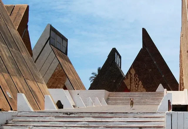 A dog pauses between abandoned buildings in Dakar, Senegal.